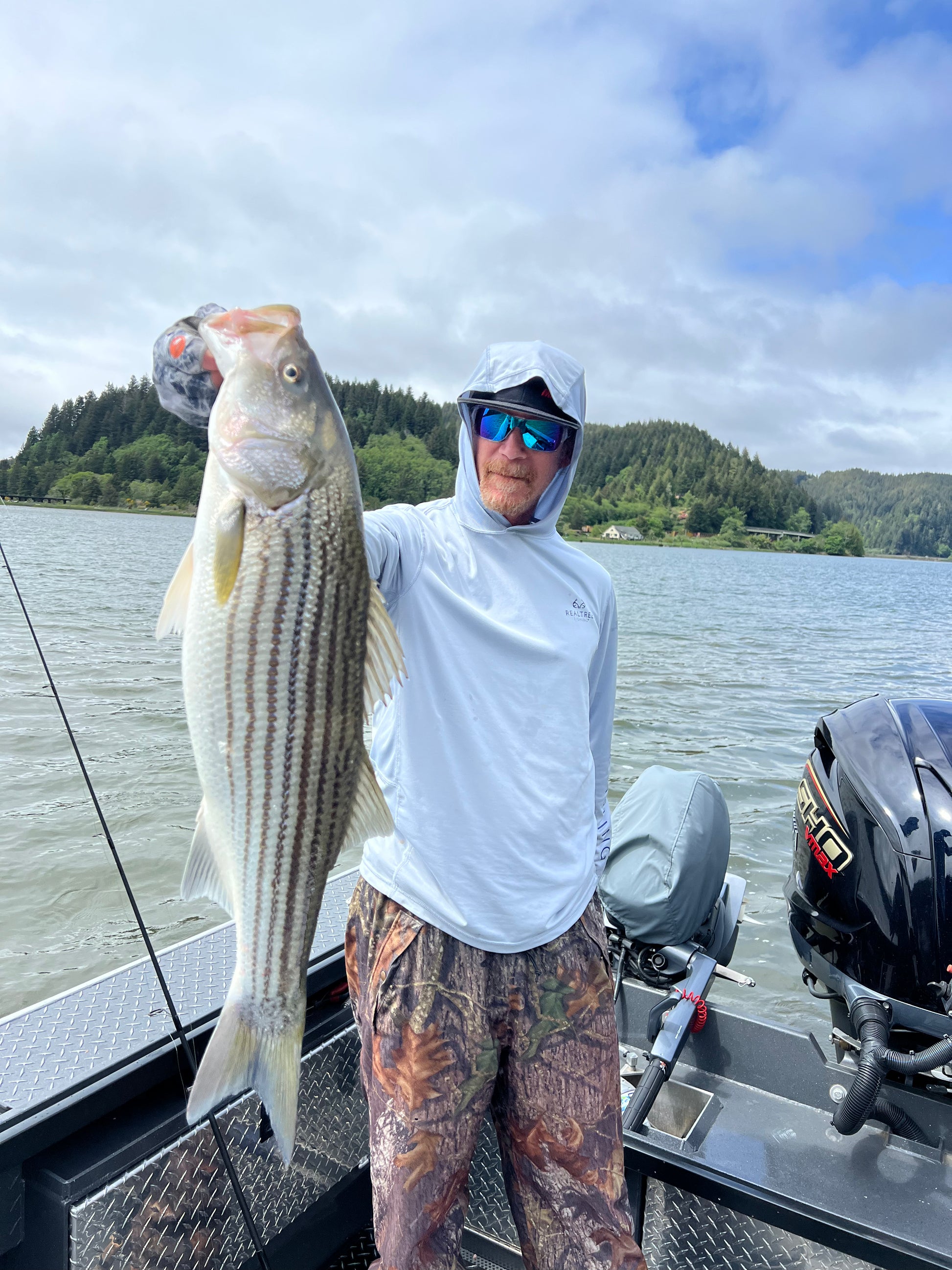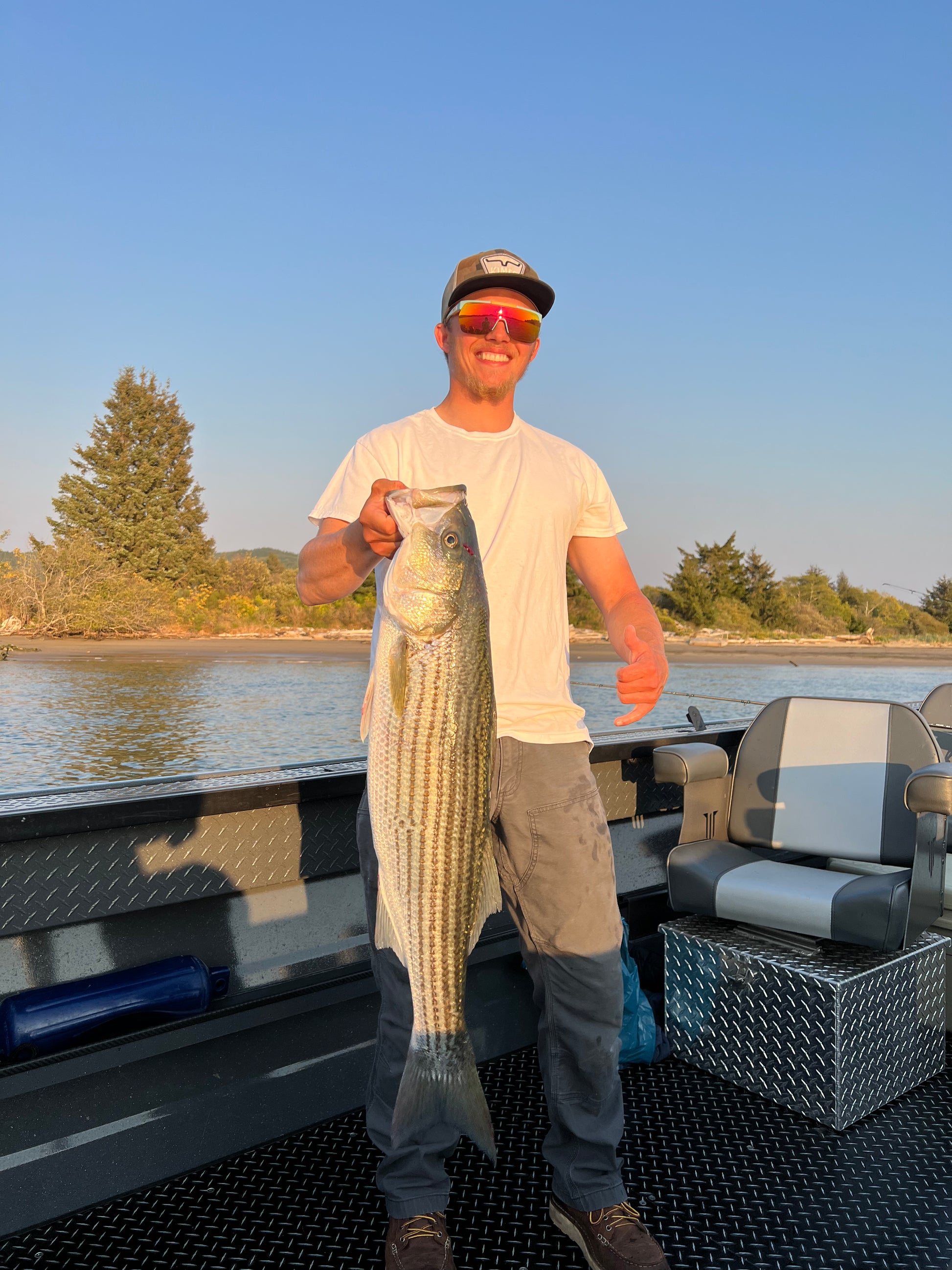 Come out on a striped bass fishing trip on the Lower Umpqua River or Smith River and have a chance at fighting these aggressive and very excellent table fair fish that average 6-15 pounds, and occasionally get bigger than 25 pounds. Don't miss the chance to experience the thrill and satisfaction of catching these powerful fish, while casting and retrieving lures. For these trips I can accommodate 3-4 people on my 24-foot Willie Boats Raptor. Your catch will be cleaned and bagged for you at the end of the day. These trips typically last 7-8 hours.
